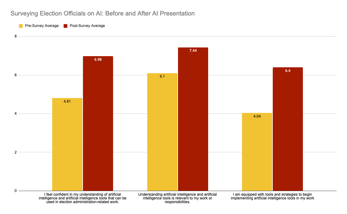 Since the beginning of the summer, we’ve been talking to election officials about AI. What we’ve found is a wide variety of viewpoints and differing levels of skepticism in understanding and using AI-enabled technologies. Our simple feedback surveys have shown something rather heartening, however. Even small interventions – in this case, an hour-long presentation on the basics of AI with some basic examples of AI at work – lead to respectable self-reported gains in overall understanding and sense of readiness in approaching AI-enabled tools.